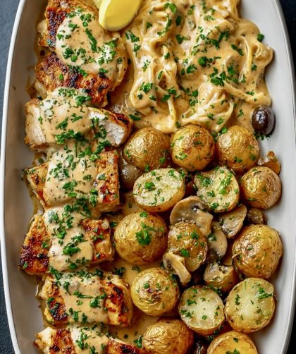 Inspired by the mouthwatering dish in your image—grilled chicken breasts with a creamy sauce, roasted baby potatoes, sautéed mushrooms, and creamy fettuccine—this recipe brings together …