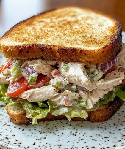 featuring two slices of golden-toasted bread enveloping a generous filling. The filling is a creamy blend of shredded chicken, diced tomatoes, red onions, and green …
