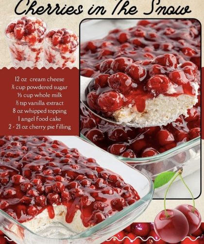 The dessert is crowned with two cans (21 oz each) of cherry pie filling, offering a glossy, vibrant red topping loaded with whole cherries. Presented …