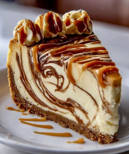 Indulge in this Decadent Caramel Swirl Cheesecake! A buttery graham cracker crust holds a creamy cheesecake swirled with rich caramel, topped with fluffy whipped cream …