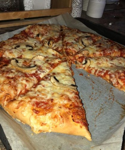 The pizza is sliced into eight equal pieces, with one slice partially removed, showcasing its gooey, appetizing interior. Presented on parchment paper atop a baking …
