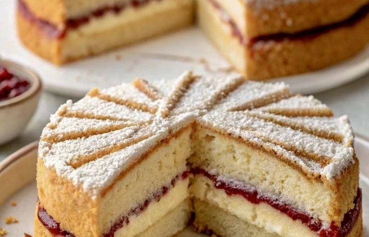 A timeless British teatime treasure—two feather-light vanilla sponge layers sandwich a silky vanilla buttercream and vibrant raspberry jam, all crowned with a delicate dusting of powdered sugar. Simple, elegant, and utterly delicious.