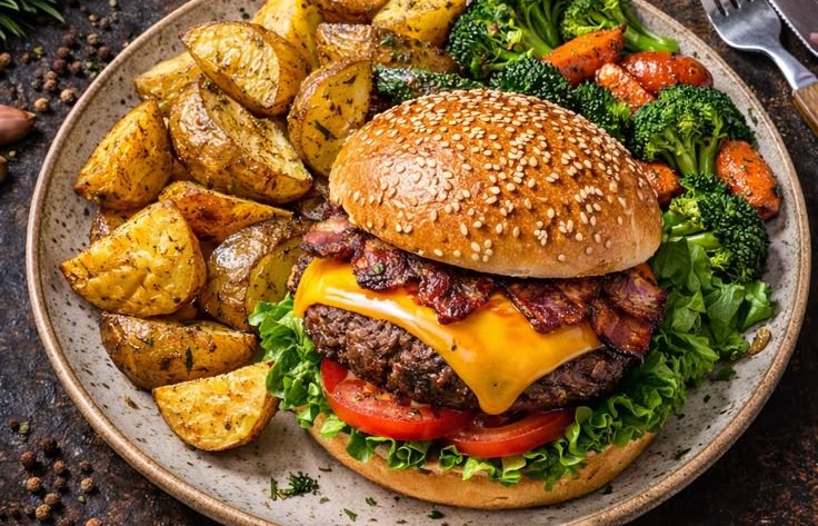 The American cheeseburger is more than just a sandwich—it’s a symbol of comfort food and a staple of American home cooking. This hearty American cheeseburger dinner takes the classic burger and turns it into a complete, satisfying meal served with crispy roasted potatoes and colorful vegetables. Juicy beef, melted cheese, fresh toppings, and perfectly seasoned sides come together to create a dinner that feels both indulgent and homemade.