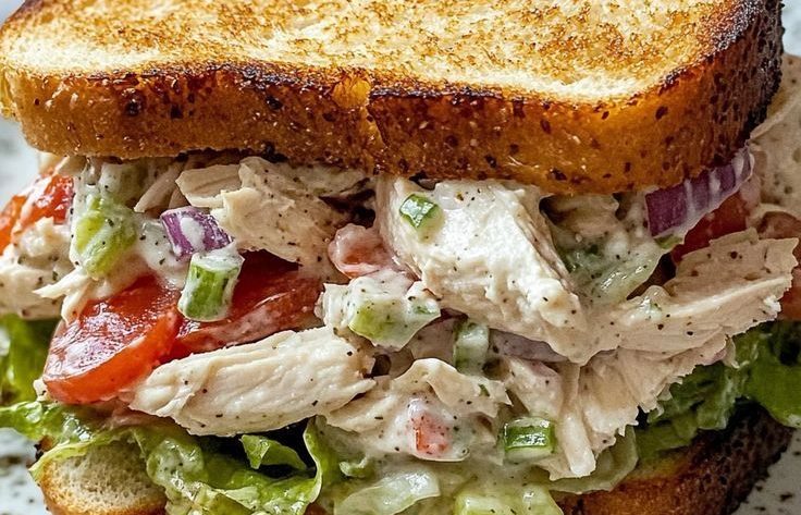 featuring two slices of golden-toasted bread enveloping a generous filling. The filling is a creamy blend of shredded chicken, diced tomatoes, red onions, and green peppers, seasoned with a hint of black pepper. Crisp lettuce leaves add a fresh layer between the filling and the bread, enhancing the texture.