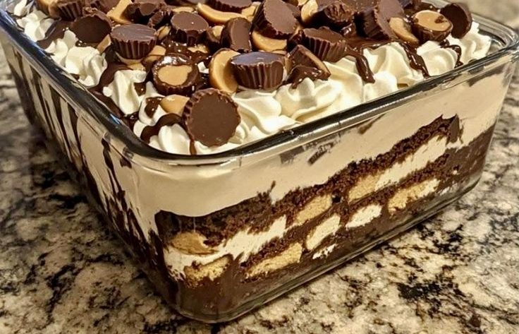 Indulge in this Heavenly Peanut Butter Cup Delight! Layers of creamy peanut butter and rich chocolate sit atop a crunchy cookie base, crowned with fluffy whipped cream, chopped peanut butter cups, and a drizzle of chocolate sauce.