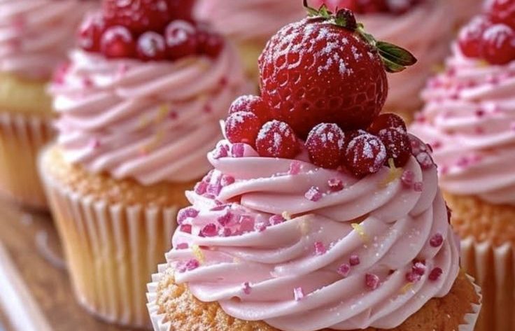 Step 5: Decorate the Cupcakes (15 minutes) Pipe a generous swirl of frosting onto each cooled cupcake, mimicking the height and texture in your image. Place a fresh strawberry on top of each, then add a few red currants around it. Dust lightly with powdered sugar using a fine sieve. Finish with a sprinkle of edible pink and white decorations for that festive look.
