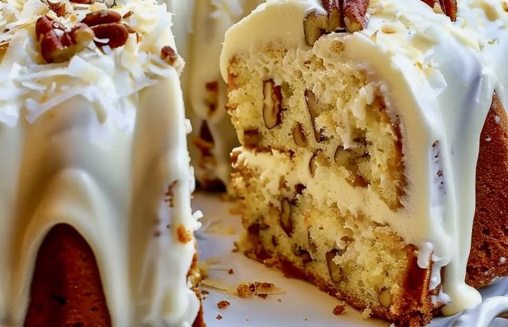 A majestic Bundt masterpiece—moist Italian cream cake studded with toasted pecans and sweetened coconut, crowned with a luscious cream cheese glaze that gracefully drips down golden edges. Topped with crunchy toasted coconut and whole pecans, it’s a Southern classic reborn: rich, tender, and irresistibly elegant.