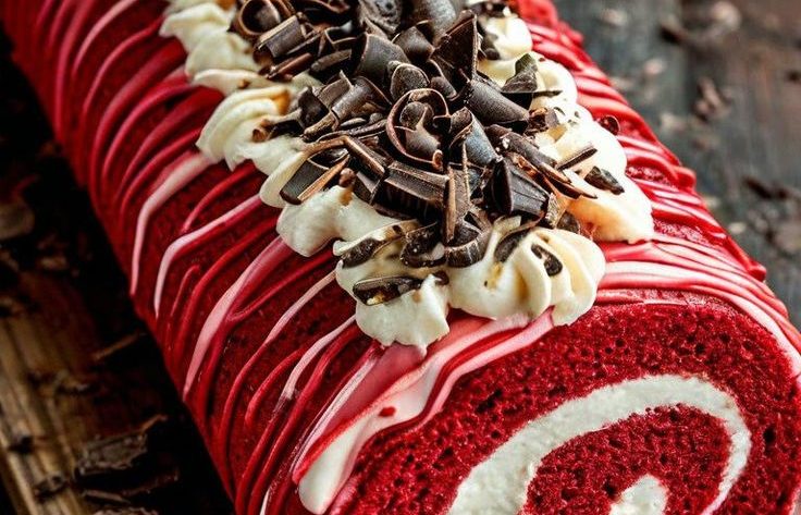 This Red Velvet Roll Cake is a delightful dessert featuring a moist, vibrant red sponge swirled with creamy filling, topped with rich chocolate shavings.