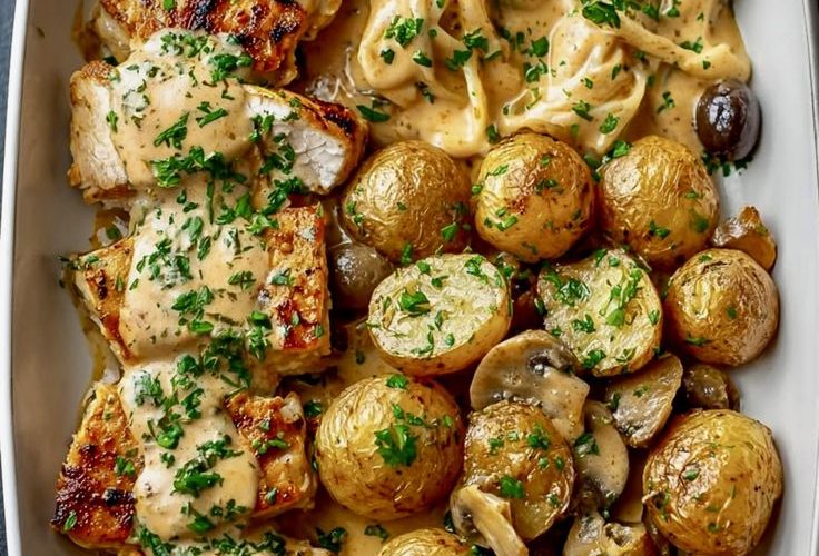 Inspired by the mouthwatering dish in your image—grilled chicken breasts with a creamy sauce, roasted baby potatoes, sautéed mushrooms, and creamy fettuccine—this recipe brings together …
