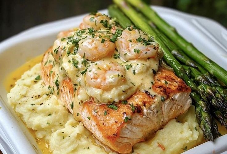 Elevate your dinner with this exquisite Seafood Stuffed Salmon, featuring succulent shrimp and crab filling, served alongside creamy Parmesan mashed potatoes and tender asparagus. Perfect …