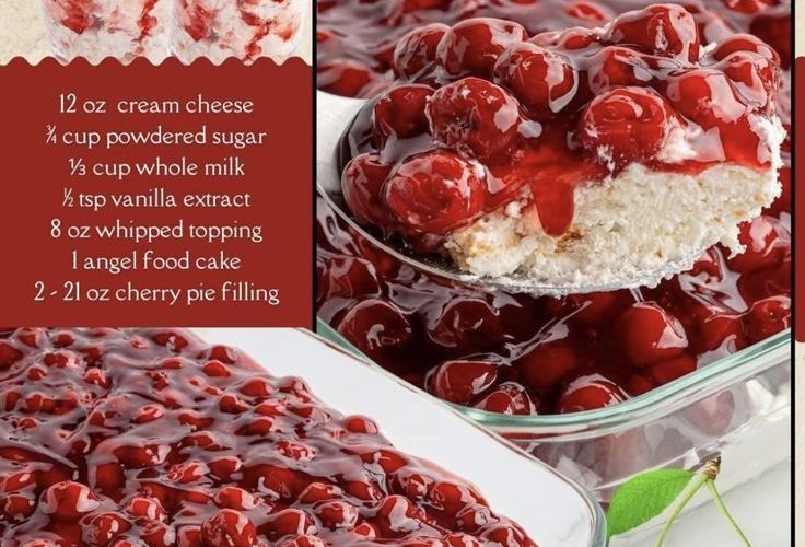 The dessert is crowned with two cans (21 oz each) of cherry pie filling, offering a glossy, vibrant red topping loaded with whole cherries. Presented …